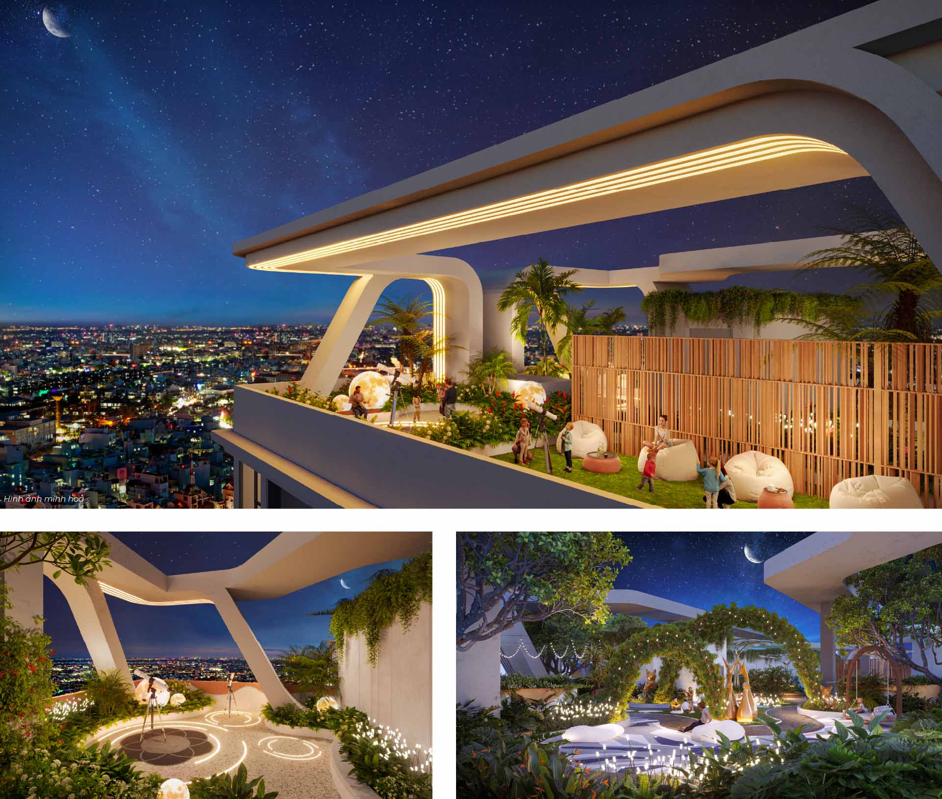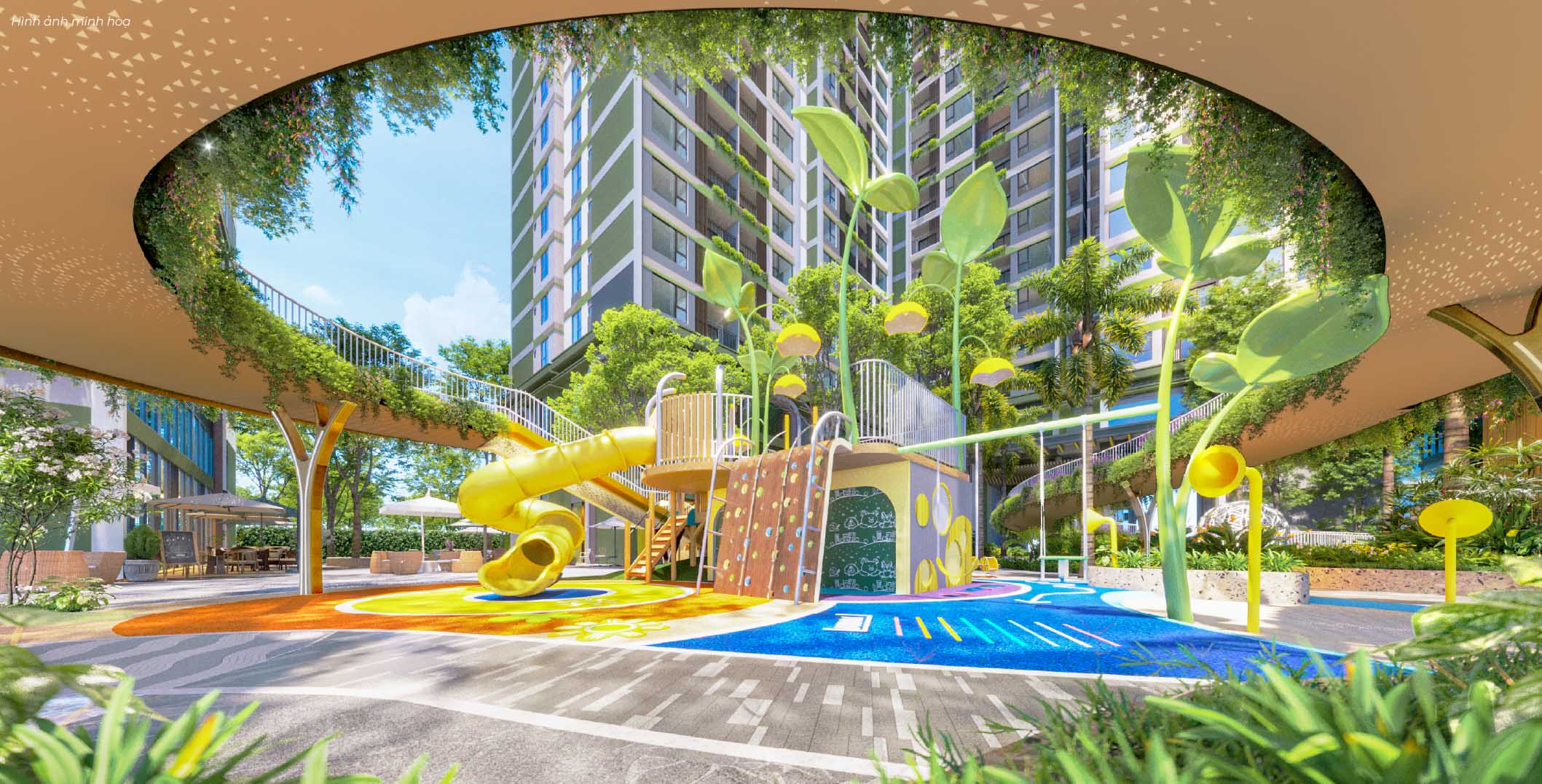 Dọc theo cây cầu đi bộ trên cao, các tiện ích và cảnh quan được kết nối mang đến không gian xanh tiện nghi và thư giãn.