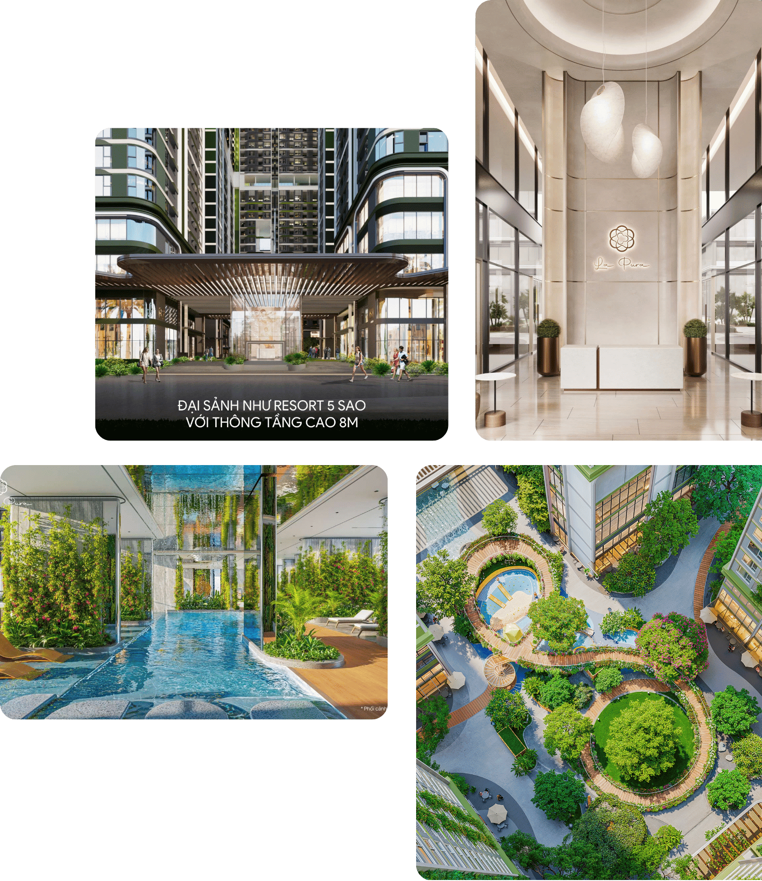 Với thiết kế phân tầng cao độ, cảnh quan tại La Pura mở ra tầm nhìn thoáng rộng, hài hòa giữa mỹ quan và công năng phục vụ. Chuỗi tiện ích được đan cài giữa những mảng xanh, xóa mờ khoảng cách giữa nhân tạo và tự nhiên.